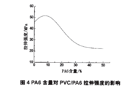 圖4是PVC/PA6共混物的拉伸強(qiáng)度曲線。從圖4可以看出,其變化趨勢同沖擊強(qiáng)度的變化趨勢基本一致,都是在PA6含量為10% 時(shí)達(dá)到較大值,此時(shí)共混物的拉伸強(qiáng)度為60MPa,較純PVC提高了30%。當(dāng)PA6含量超過10% ,共混物的拉伸強(qiáng)度逐漸降低;當(dāng)PA6含量超過35% 以后,拉伸強(qiáng)度逐漸趨于平穩(wěn)。從圖3和圖4可以看出,當(dāng)PVC與PA6的配比為90/10時(shí),共混物的缺IzI沖擊強(qiáng)度和拉伸強(qiáng)度都較純PVC有明顯改善。