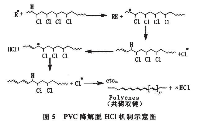 PVC樹脂降解脫HC1是型材變色的主要內(nèi)部因素,其降解機(jī)制示意圖見圖5。
