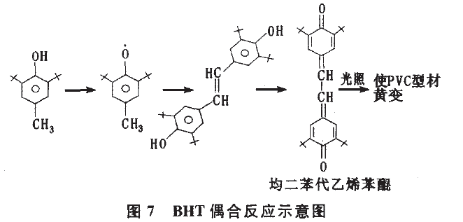 目前。PVC型材生產(chǎn)廠家使用的穩(wěn)定劑以復(fù)合穩(wěn)定劑為主,除了對(duì)PVC降解起穩(wěn)定作用的主體化合物。還包含潤(rùn)滑體系、抗氧體系等助穩(wěn)定體系。其中的抗氧體系可能包括酚類穩(wěn)定劑和亞磷酸酯類助穩(wěn)定劑。這些化合物可能含有易變色的有機(jī)雜質(zhì),另外它們自身有可能在光、氧、水的作用下發(fā)生變色反應(yīng)。有資料報(bào)道指出,某些亞磷酸酯類產(chǎn)品可能含有顏色污染性成分。常用的亞磷酸酯類產(chǎn)品有亞磷酸酯三苯酯(TPP)和亞磷酸一苯二異辛醇(PDLOP),其中TPP由苯酚和三氧化磷反應(yīng)制得。苯酚是一種化學(xué)性質(zhì)不穩(wěn)定的物質(zhì),它在光照下會(huì)發(fā)生互變異構(gòu)反應(yīng),呈紅褐色。如果TPP生產(chǎn)過(guò)程控制不嚴(yán),會(huì)造成產(chǎn)品羥基值過(guò)大,即殘留較多的苯酚單體,這樣的產(chǎn)品就可能導(dǎo)致型材在室外貯存或應(yīng)用時(shí)發(fā)生變色現(xiàn)象。即使TPP無(wú)殘留苯酚單體,因其水解穩(wěn)定性差,在潮濕、光照和受熱條件下會(huì)水解生成苯酚單體,也使型材變色。某些低空間位阻效應(yīng)的酚類抗氧劑(如BHT),可能在紫外線照射、一定的濕度和氧的條件下發(fā)生偶合反應(yīng)(如圖7所示)。
