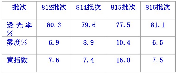 由表2可知:第815批次料的光學(xué)性能明顯比第812批次、第816批次差,尤其是黃色指數(shù)和霧度大大高于后者;而色澤稍差的第814批次料的霧度高于第812批次、第816批次,但低于第815批次。